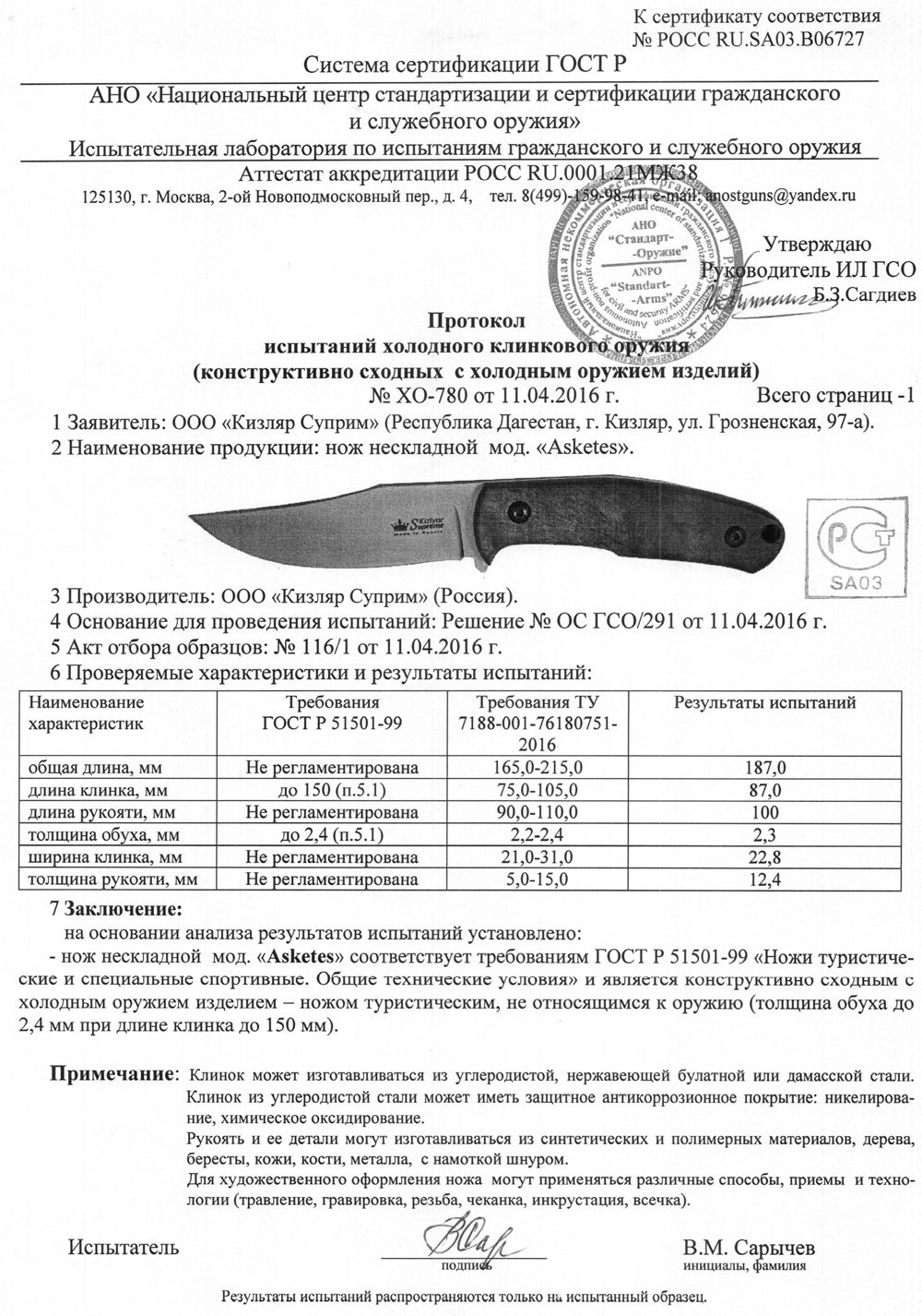 Нож Askete Kizlyar Supreme не является холодным оружием.