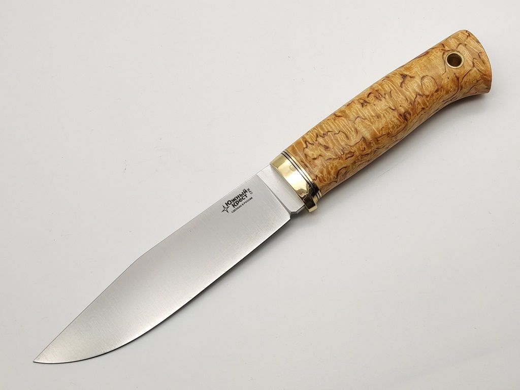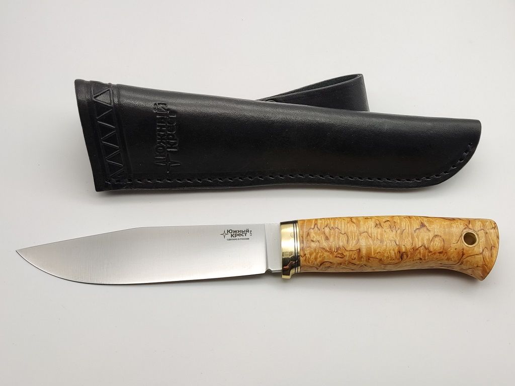 Туристический нож Бер производства Южный Крест выполнен в классическом стиле: всадной монтаж, рукоять из ценной карельской березы, кожаные ножны с двумя видами подвеса. При этом используются модная ножевая сталь клинка N690 и современный подход. Например, проставки черного цвета между гардой и рукоятью, продуманное отверстие с латунной втулкой под темляк.
