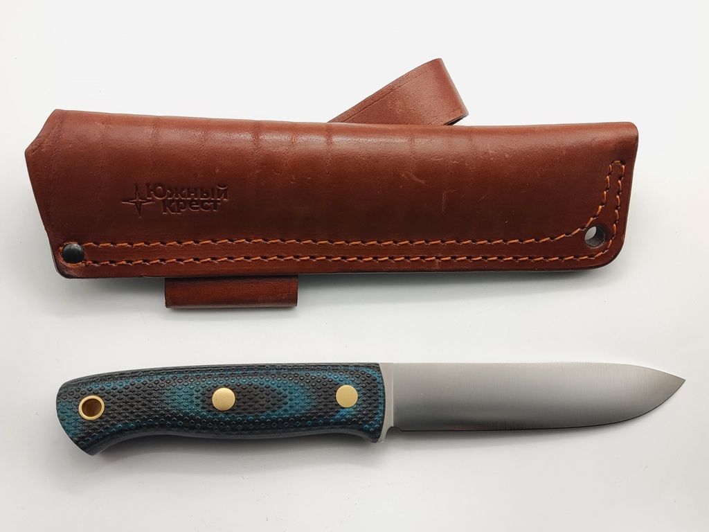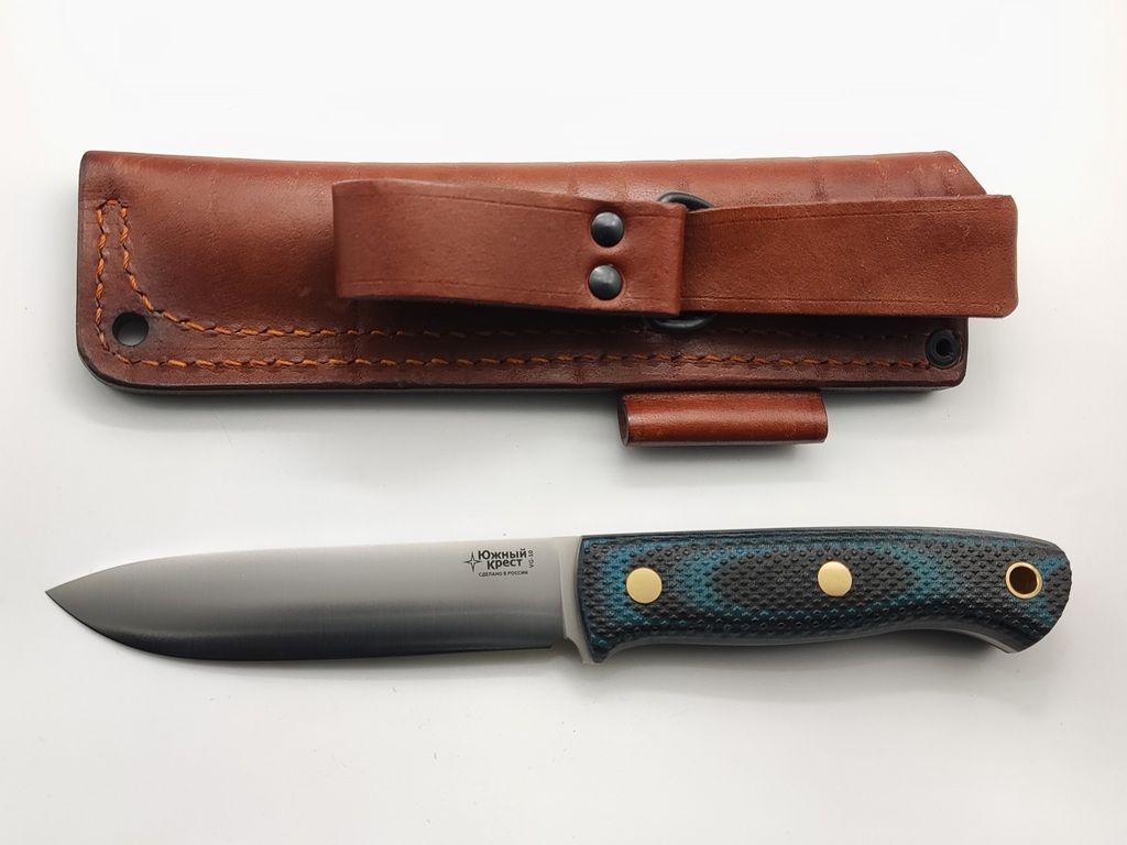Micarta - отличный материал для рукояти ножа. Изготавливается из слоев ткани и бумаги, пропитанной синтетическими смолами. Материал часто используется в электротехнике, больше известен как гетинакс. Легко обрабатывается и полируется. При этом микарта остается прочным материалом, не скользит в руке, имеет хорошую теплопроводность. Совершенно не впитывает влагу и стоек к агрессивным средам. Подбор цвета и дизайна микарты делает нож красивым и привлекательным. А синий цвет редко встречается в природе и синий нож сложно забыть на привале.