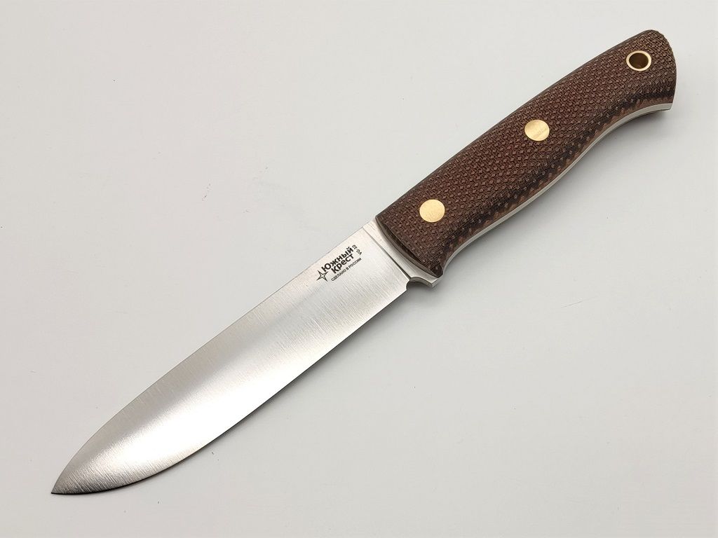 Нож Бушкрафт заслуженно является самой популярной моделью Южного Креста. Подобный клубный Бушкрафт выпускался в порошковой стали. В бюджетном исполнении из стали VG-10, нож более доступен, но не менее функционален. На данном экземпляре реализована "линза в ноль", т.е. заточка конвекс начинается от обуха.