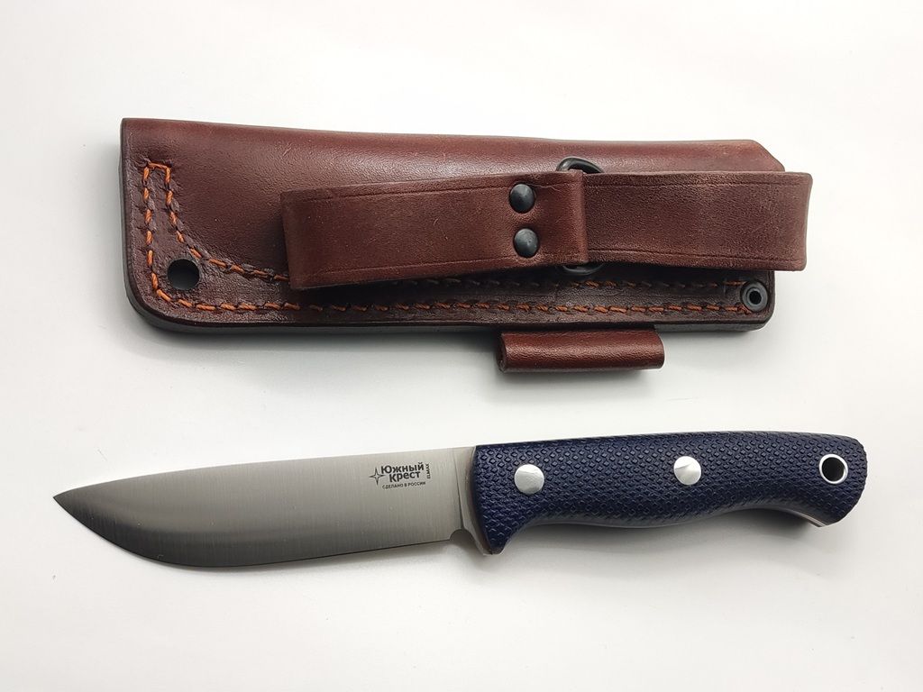 В комплекте с ножом Caribou L идут ножны прямоугольной формы из натуральной кожи коричневого цвета с оранжевой ниткой. Ножны можно носить как на ремне, так и на свободном подвесе. Ножны снабжены пластиковой вставкой для предотвращения пореза кожи при неаккуратном вложении ножа в ножны. Имеется отверстие для отвода влаги и слот для ношения огнива. Обязательным элементом дизайна является тиснение логотипа Южный Крест.