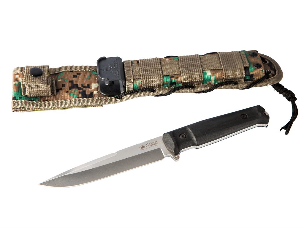 Нож Delta комплектуется чёрными ножнами НАТОвского образца с креплениями MOLLE позволяют вставлять нож любой стороной, что важно для армейского ножа и особенно важно для левши. Надежное крепление клинка в ножнах позволяет носить нож Центурион рукоятью вниз. Для данной модели в комплекте ножны цвета Camo.
