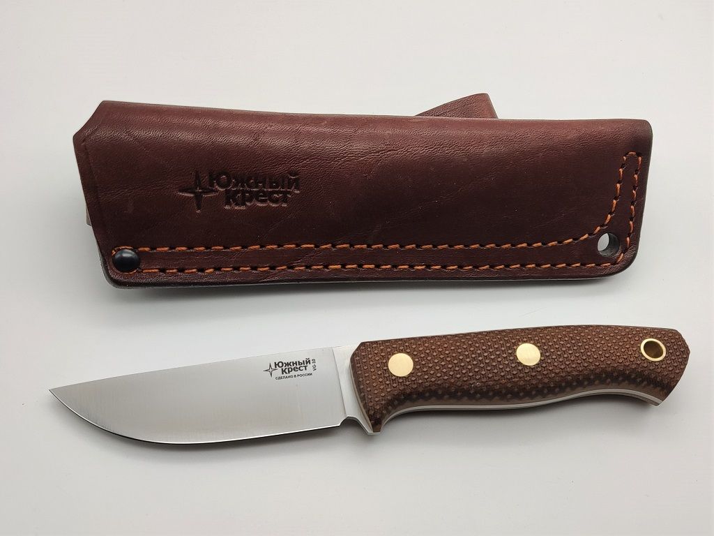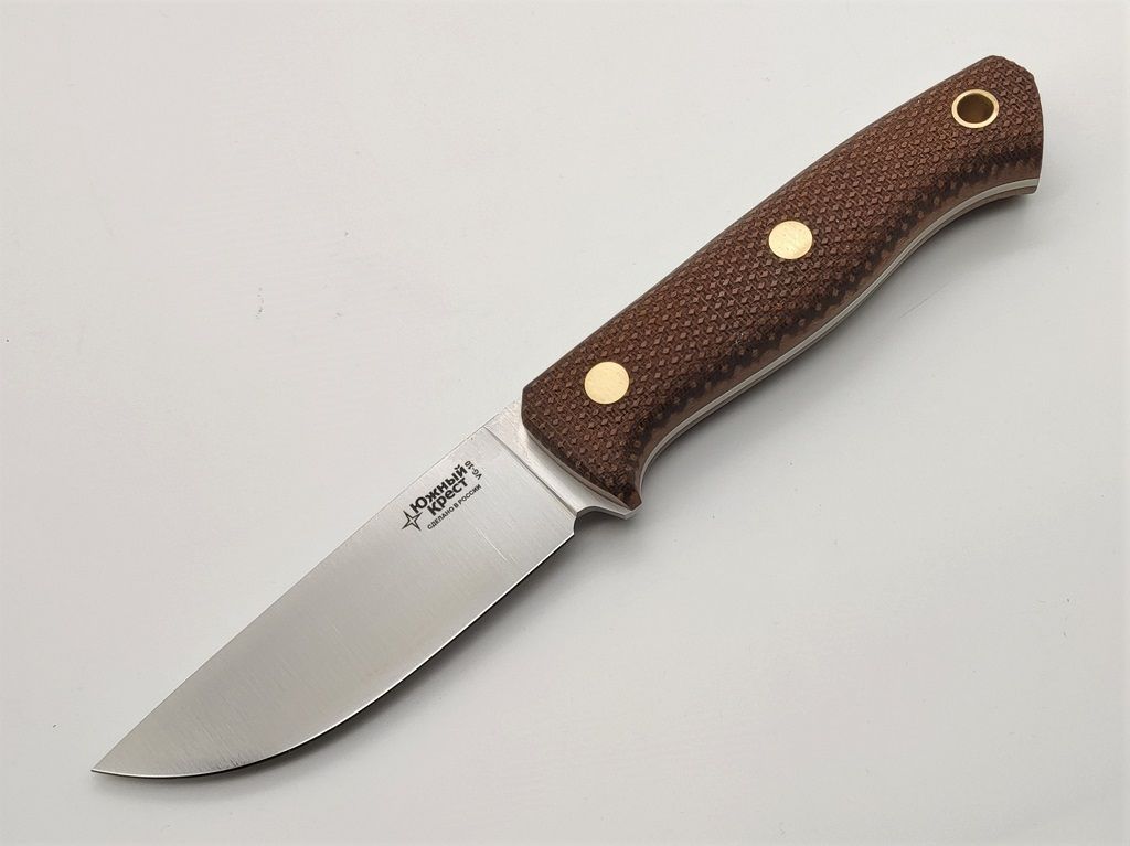 Micarta - отличный материал для рукояти ножа. Изготавливается из слоев ткани, пропитанной синтетическими смолами. Материал часто используется в электротехнике. Легко обрабатывается и полируется. Микарта не впитывает воду, нейтральна к агрессивным средам, не меняет свойств при морозе и высоких температурах. Подбор цвета и дизайна микарты делает нож красивым и привлекательным. Нанесение оружейной насечки - ноу хау Южного Креста.
