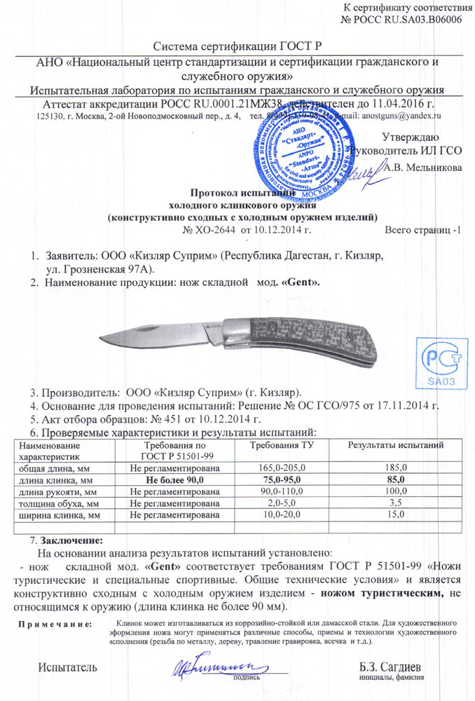 | Длина клинка | 82 мм | Обработка клинка | Полированный |
