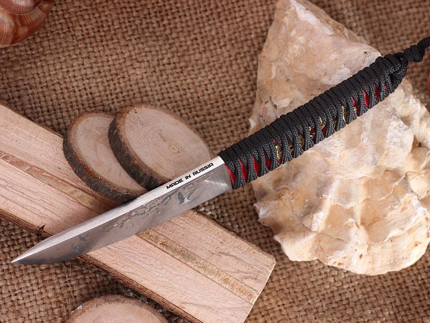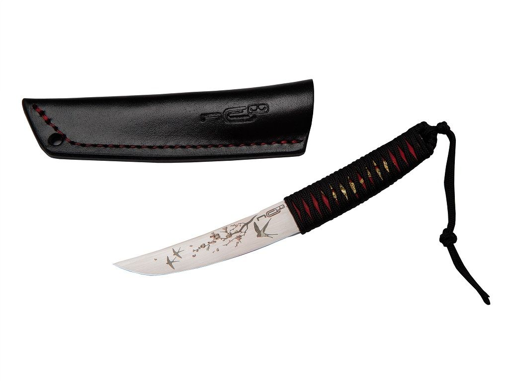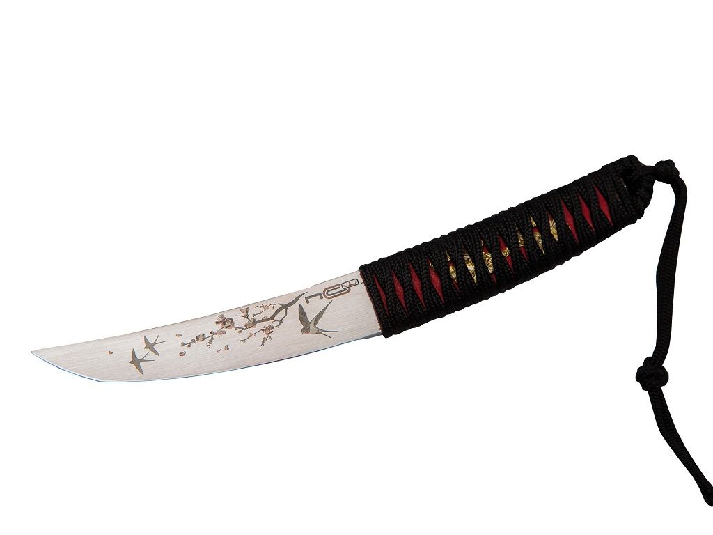 По форме клинка нож Haruco N.C. Custom можно отнести к танто. По конструкции фултанг с плетеной рукоятью. На клинке нанесена цветная гравировка с японскими мотивами: ветки цветущей сакуры и порхающие ласточки. Заточка односторонняя, правая.