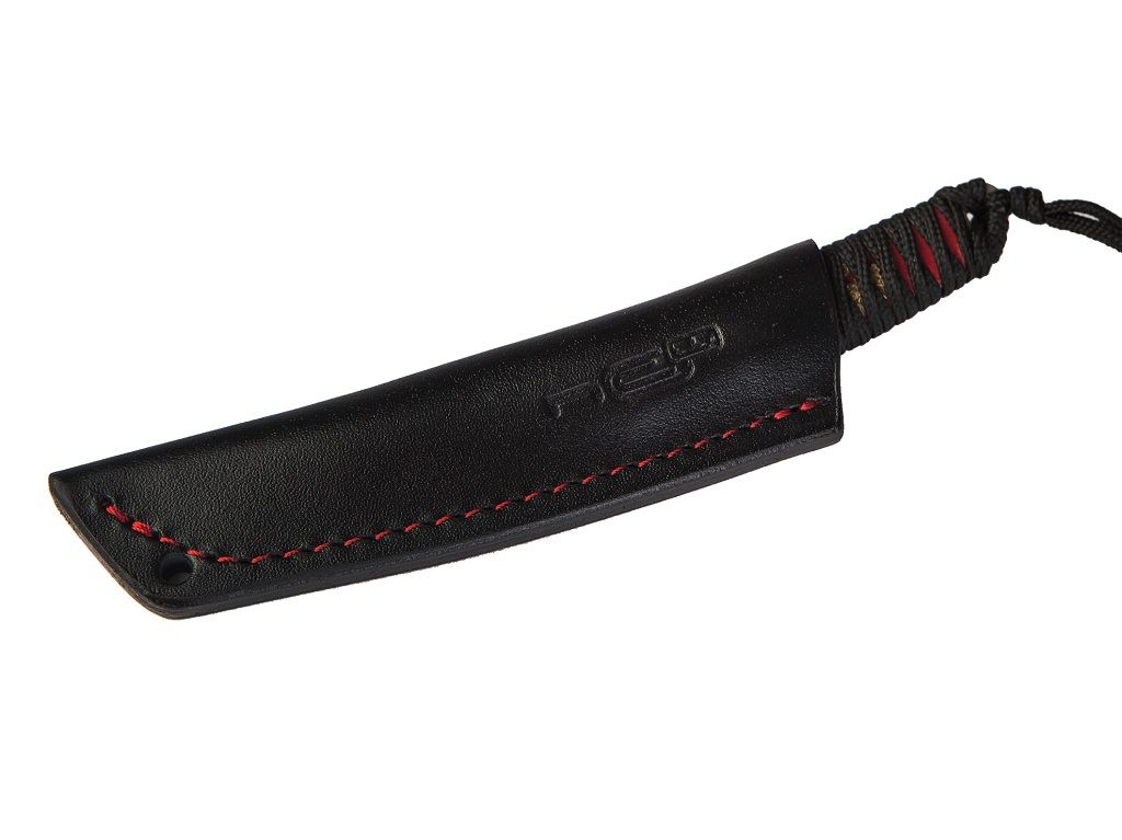 Ножны Haruco N.C. Custom выполнены из толстой кожи черного цвета с красной прострочкой. Фактически не имеется каких-либо креплений, поэтому это скорее чехол, а не ножны. Отверстие в нижней части может выполнять эстетическую роль (добавить стильную бусину) или практическую цель (закрепить чехол на одежде). На чехле тиснением нанесен фирменный логотип N.C. Custom.