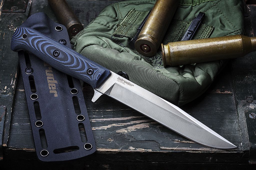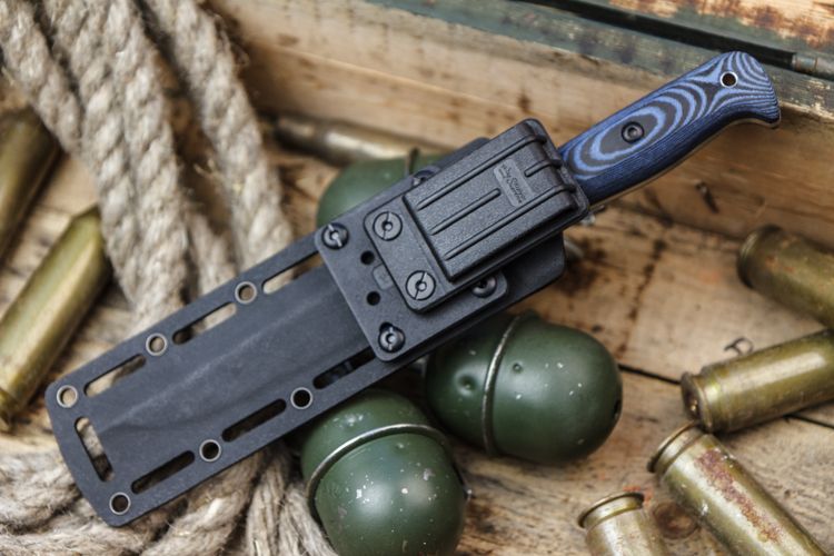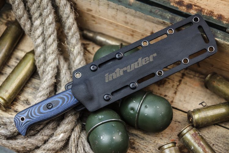 Нож Интрудер является цельнометаллическим ножом, но при этом накладки из Micarta заменяемые, что тоже большая редкость для фултангов. При помощи клипсы ножны из Cydex совместимы с креплением MOLLE, а если использовать две клипсы - то ножны можно закрепить вдоль ремня.