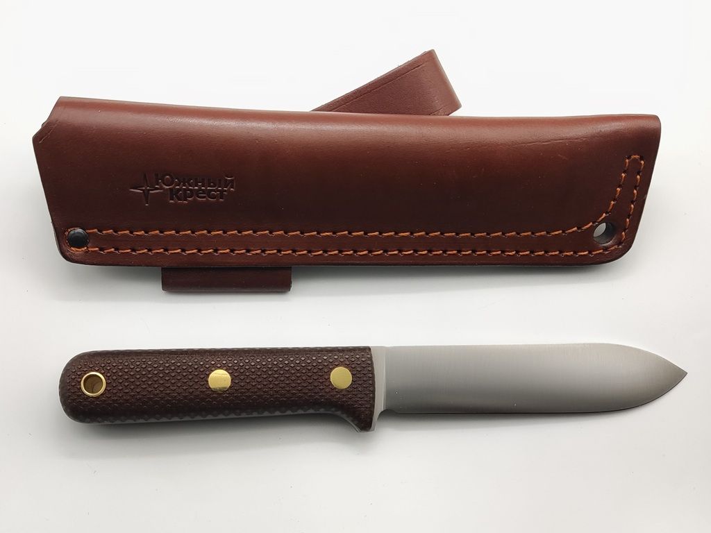 Micarta - отличный материал для рукояти ножа. Изготавливается из слоев ткани, пропитанной синтетическими смолами. Материал часто используется в электротехнике, больше известен как гетинакс. Легко обрабатывается и полируется. Микарта не впитывает воду, нейтральна к агрессивным средам, не меняет свойств при морозе и высоких температурах. Для того, чтобы рука не соскальзывала при работе, на накладки нанесена оружейная насечка. Как показывает практика, при такой обработке накладок рука не скользит даже в дождь и при попадании грязи.