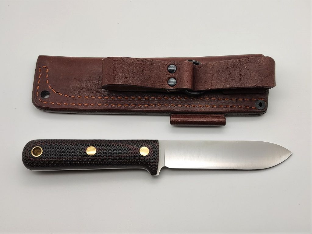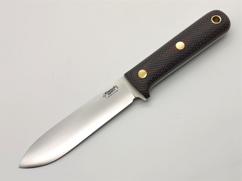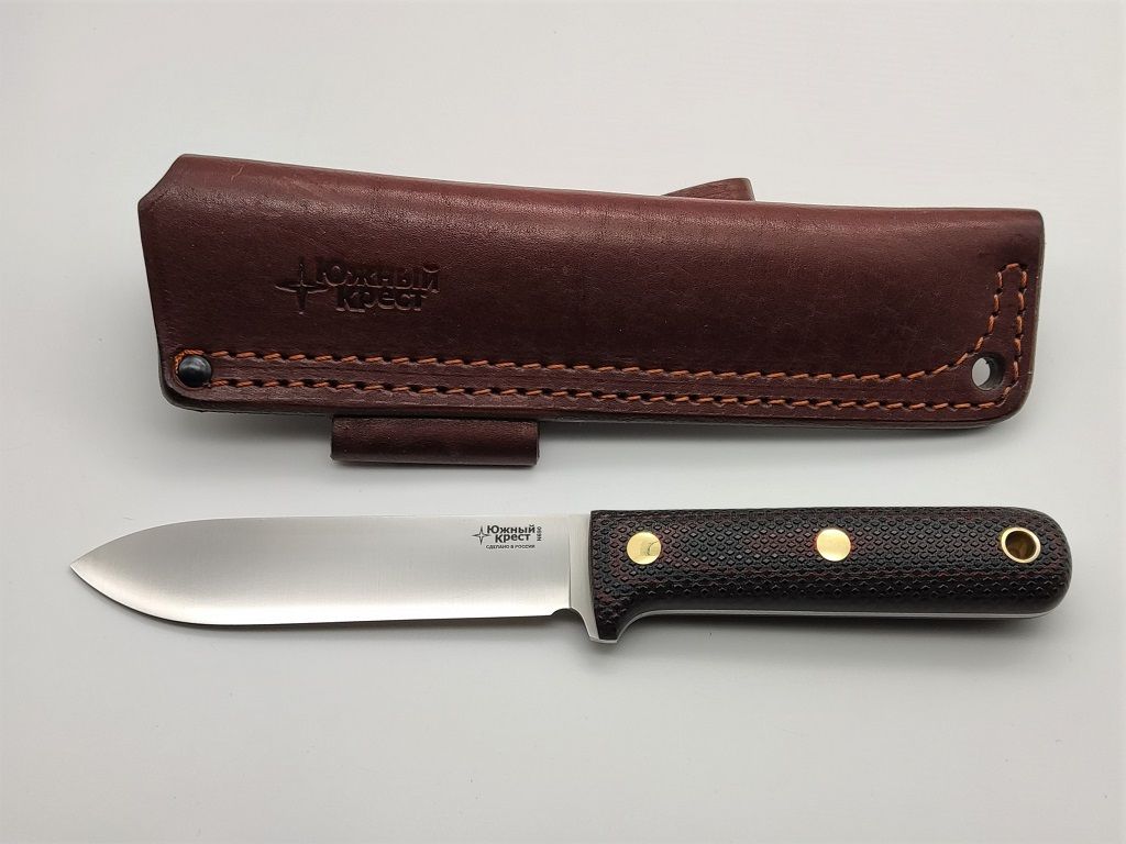 Micarta - отличный материал для рукояти ножа. Изготавливается из слоев ткани, пропитанной синтетическими смолами. Материал часто используется в электротехнике, больше известен как гетинакс. Легко обрабатывается и полируется. Микарта не впитывает воду, нейтральна к агрессивным средам, не меняет свойств при морозе и высоких температурах. Для того, чтобы рука не соскальзывала при работе, на накладки нанесена оружейная насечка. Как показывает практика, при такой обработке накладок рука не скользит даже в дождь и при попадании грязи.