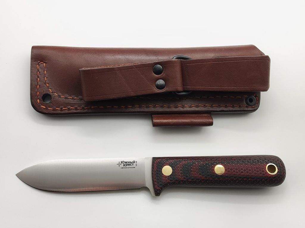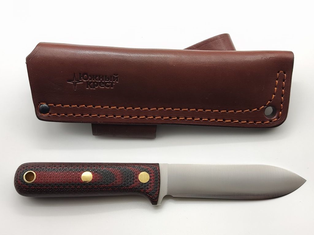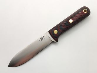 Micarta - отличный материал для рукояти ножа. Изготавливается из слоев ткани, пропитанной синтетическими смолами. Материал часто используется в электротехнике, больше известен как гетинакс. Легко обрабатывается и полируется. Микарта не впитывает воду, нейтральна к агрессивным средам, не меняет свойств при морозе и высоких температурах. Для того, чтобы рука не соскальзывала при работе, на накладки нанесена оружейная насечка. Как показывает практика, при такой обработке накладок рука не скользит даже в дождь и при попадании грязи.