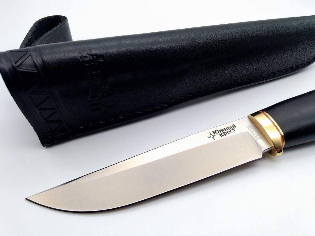 Нож Кузьмич укомплектован качественными кожаными ножнами черного цвета. Предусмотрено два варианта ношения: свободный подвес и жестко на ремне. Ножны снабжены пластиковой вставкой для предотвращения пореза кожи. Имеется отверстие для отвода влаги и воды, попавшей в ножны в сырую погоду. Обязательным элементом дизайна является тиснение на коже логотипа Южный Крест.