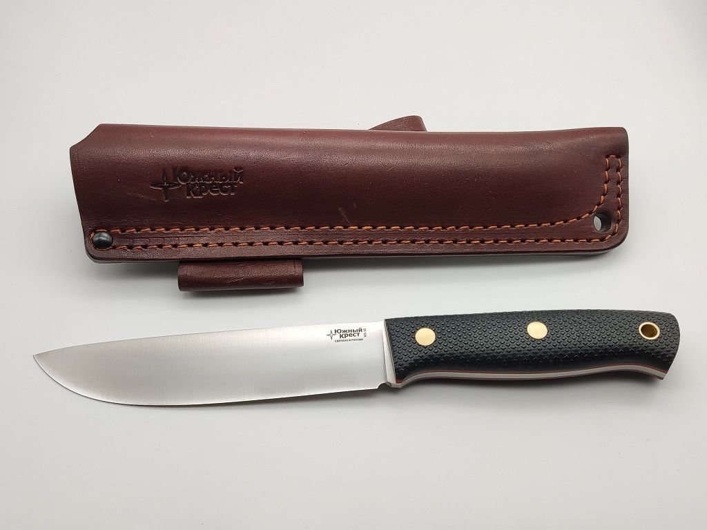 Нож X укомплектован качественными кожаными ножнами типа Бушкрафт коричневого цвета с оранжевой прострочкой. Предусмотрено два варианта ношения: свободный подвес и жестко на ремне. Ножны снабжены пластиковой вставкой для предотвращения пореза кожи и отверстием для отвода влаги. Имеется слот для ношения огнива. Обязательным элементом дизайна является тиснение логотипа Южный Крест.