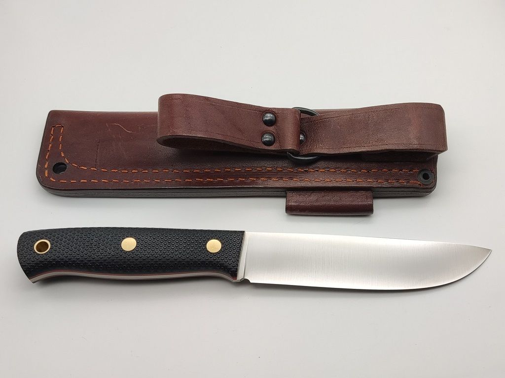 По конструкции - цельнометаллический нож с накладками из микарты. Плашки крепятся на две латунные стяжки Корби и трубчатую клёпку под темляк. По форме клинка нож относится к типу DROP-POINT. На рукояти имеются выемки, благодаря которым нож не соскальзывает при работе.