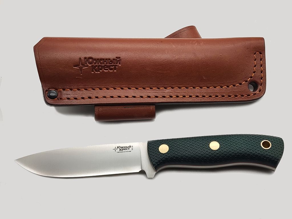 Нож Скаут укомплектован качественными кожаными ножнами типа Бушкрафт. Расцветка кожи коричневая, с оранжевой прострочкой. Предусмотрено два варианта ношения: свободный подвес и жестко на ремне. Ножны снабжены пластиковой вставкой для предотвращения пореза кожи и отверстием для отвода влаги. Имеется слот для ношения огнива или мусата. Обязательным элементом дизайна является тиснение логотипа Южный Крест.