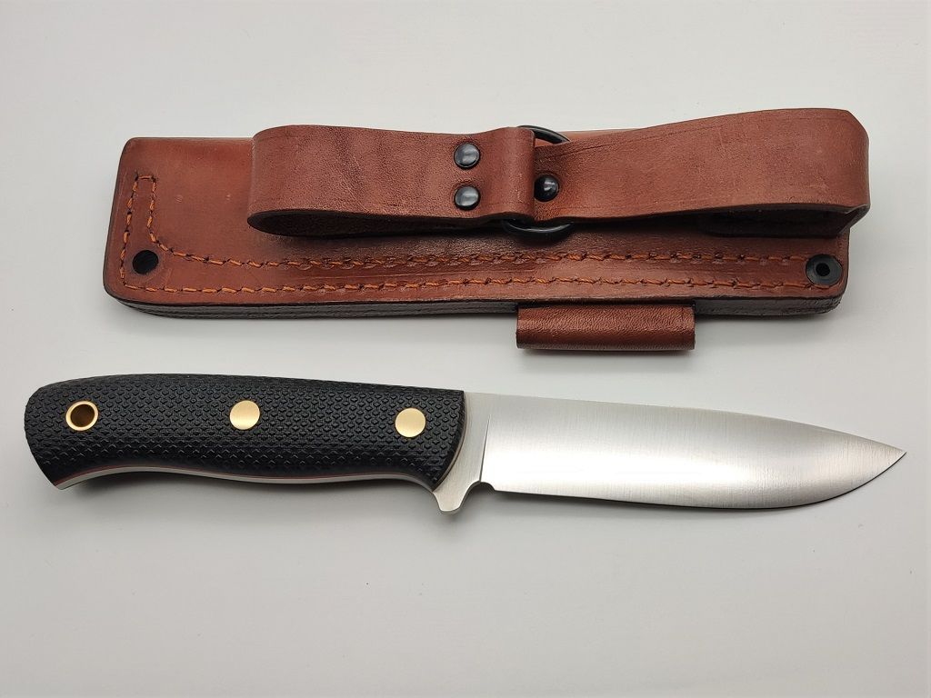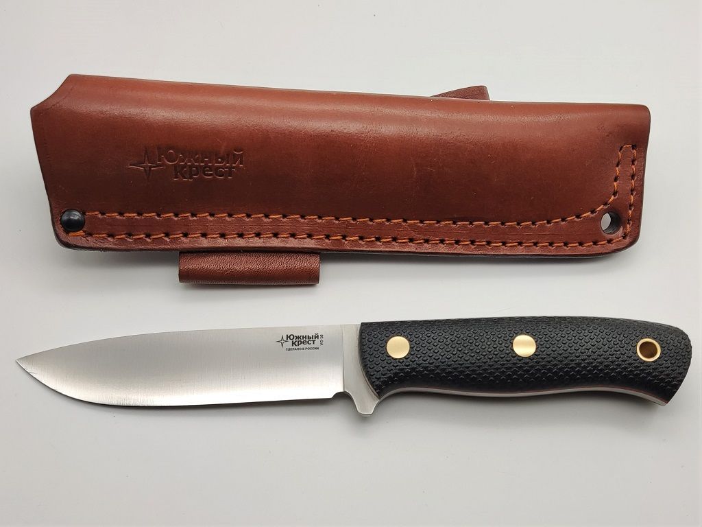 Нож Скаут L укомплектован качественными кожаными ножнами типа Бушкрафт. Расцветка кожи коричневая, с оранжевой прострочкой. Предусмотрено два варианта ношения: свободный подвес и жестко на ремне. Ножны снабжены пластиковой вставкой для предотвращения пореза кожи и отверстием для отвода влаги. Имеется слот для ношения огнива или мусата. Обязательным элементом дизайна является тиснение логотипа Южный Крест.