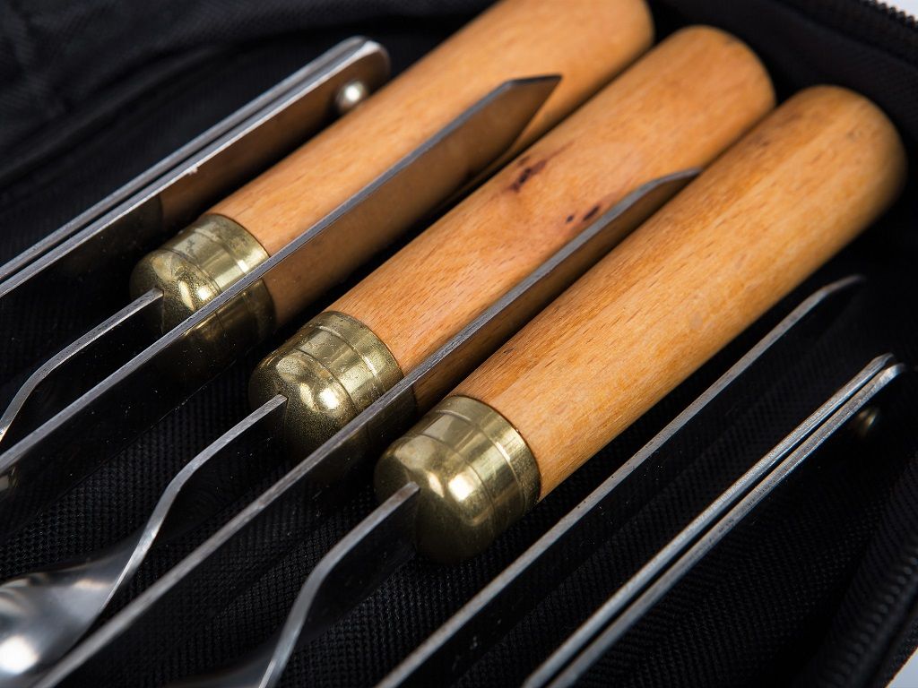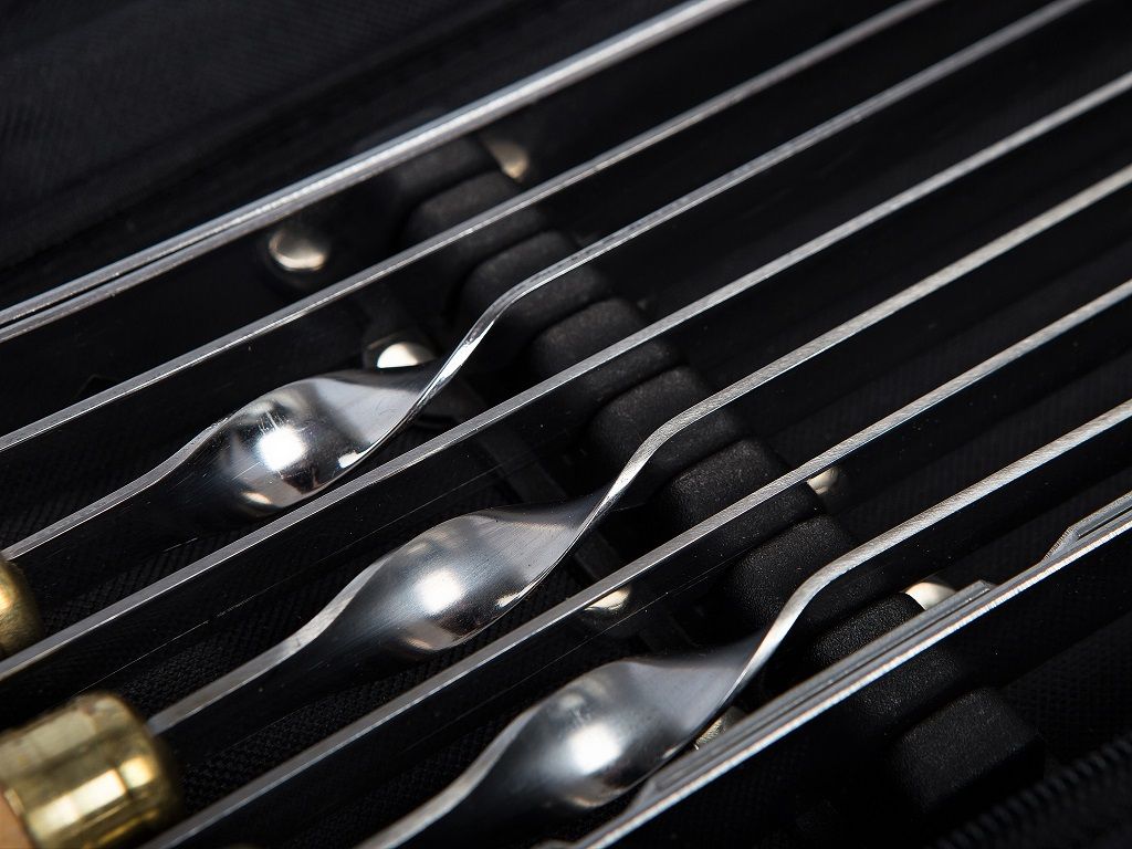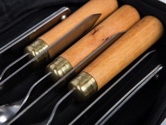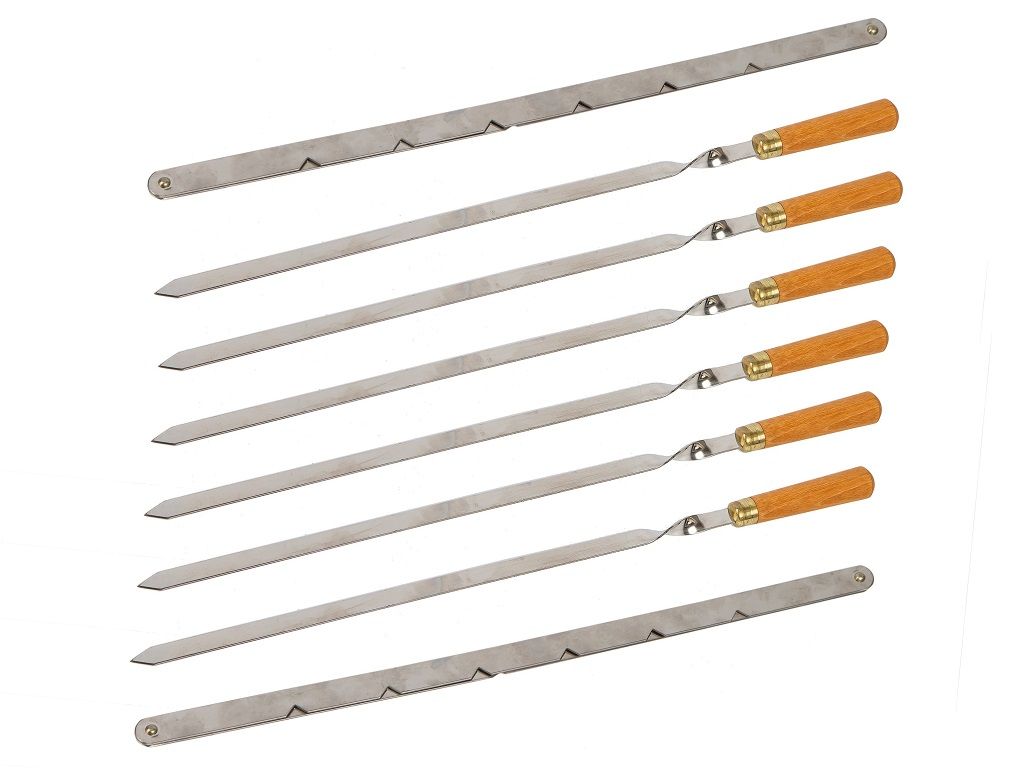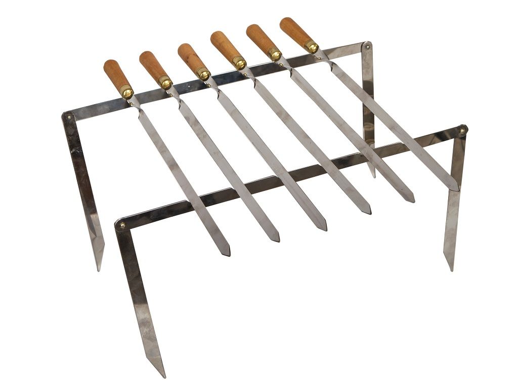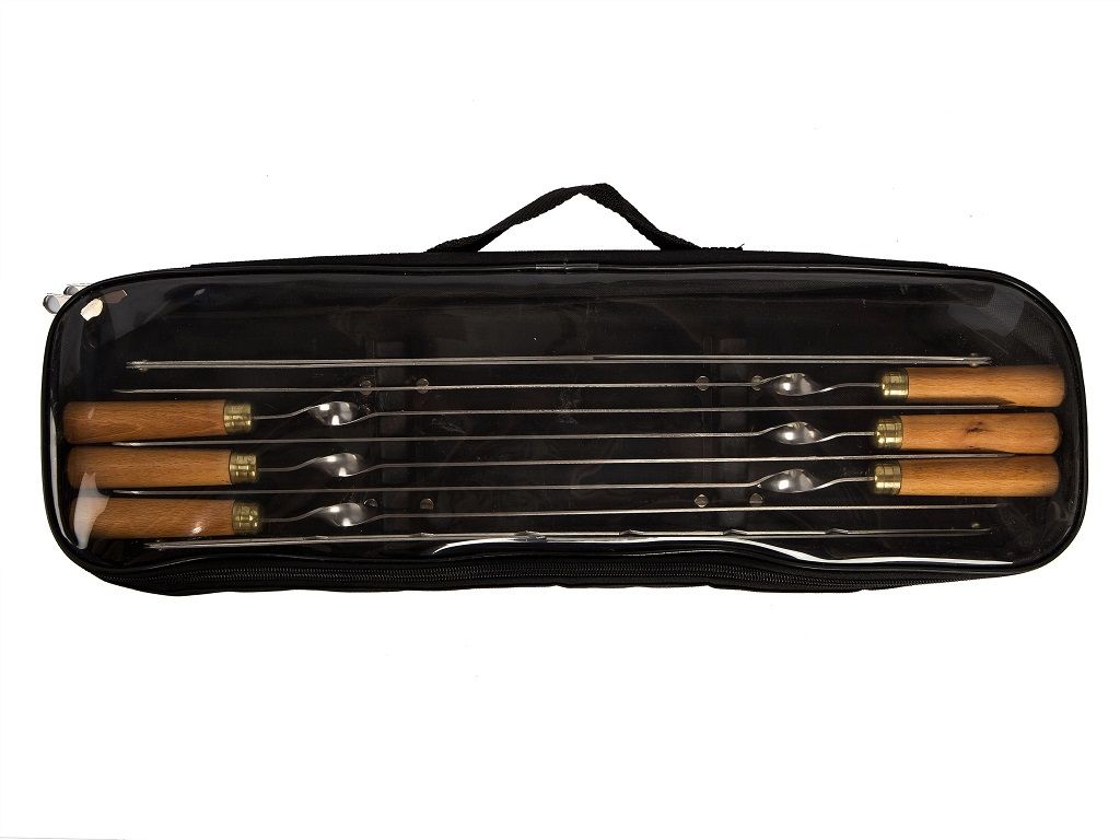 Дорожный набор шампуров со стойками для организации мангала. Хорош тем, что легкий, компактный и полезный. Во-первых, не займет много места в багажнике автомобиля. Во-вторых, можно далеко отойти от автомобиля, углубиться в лес для поиска наиболее подходящего места. При этом в целом шампура полноценной длины, надежные, с удобными рукоятями из дерева. И поэтому зачастую используются и на домашнем мангале.