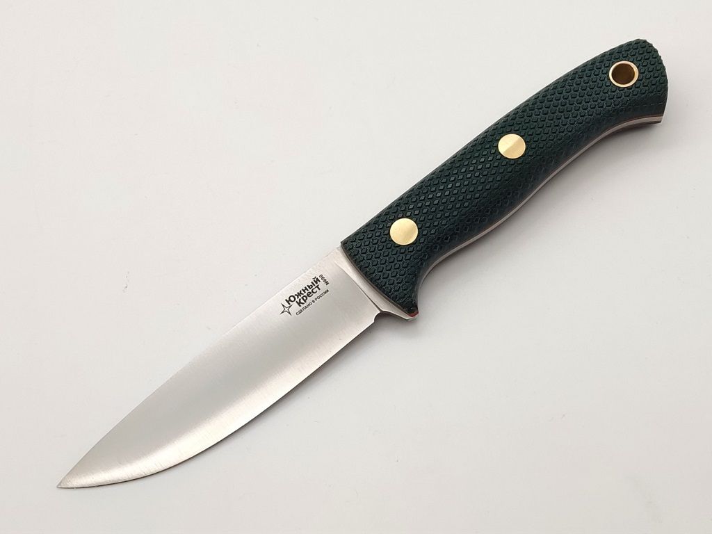 Micarta - отличный материал для рукояти ножа. Изготавливается из слоев ткани, пропитанной синтетическими смолами. Материал часто используется в электротехнике, больше известен как гетинакс. Легко обрабатывается и полируется. Микарта не впитывает воду, нейтральна к агрессивным средам, не меняет свойств при морозе и высоких температурах. Для того, чтобы рука не соскальзывала при работе, на накладки нанесена оружейная насечка. Как показывает практика, при такой обработке накладок рука не скользит даже в дождь и при попадании грязи.