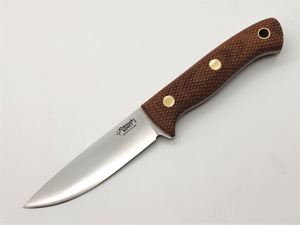 Micarta - отличный материал для рукояти ножа. Изготавливается из слоев ткани, пропитанной синтетическими смолами. Материал часто используется в электротехнике, больше известен как гетинакс. Легко обрабатывается и полируется. Микарта не впитывает воду, нейтральна к агрессивным средам, не меняет свойств при морозе и высоких температурах. Для того, чтобы рука не соскальзывала при работе, на накладки нанесена оружейная насечка. Как показывает практика, при такой обработке накладок рука не скользит даже в дождь и при попадании грязи.