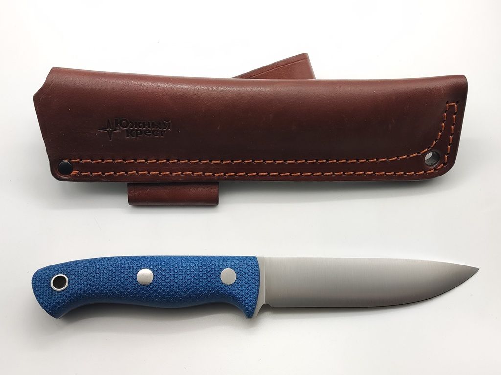 Micarta - отличный материал для рукояти ножа. Изготавливается из слоев ткани, пропитанной синтетическими смолами. Материал часто используется в электротехнике, больше известен как гетинакс. Легко обрабатывается и полируется. Микарта не впитывает воду, нейтральна к агрессивным средам, не меняет свойств при морозе и высоких температурах. Для того, чтобы рука не соскальзывала при работе, на накладки нанесена оружейная насечка. Как показывает практика, при такой обработке накладок рука не скользит даже в дождь и при попадании грязи.