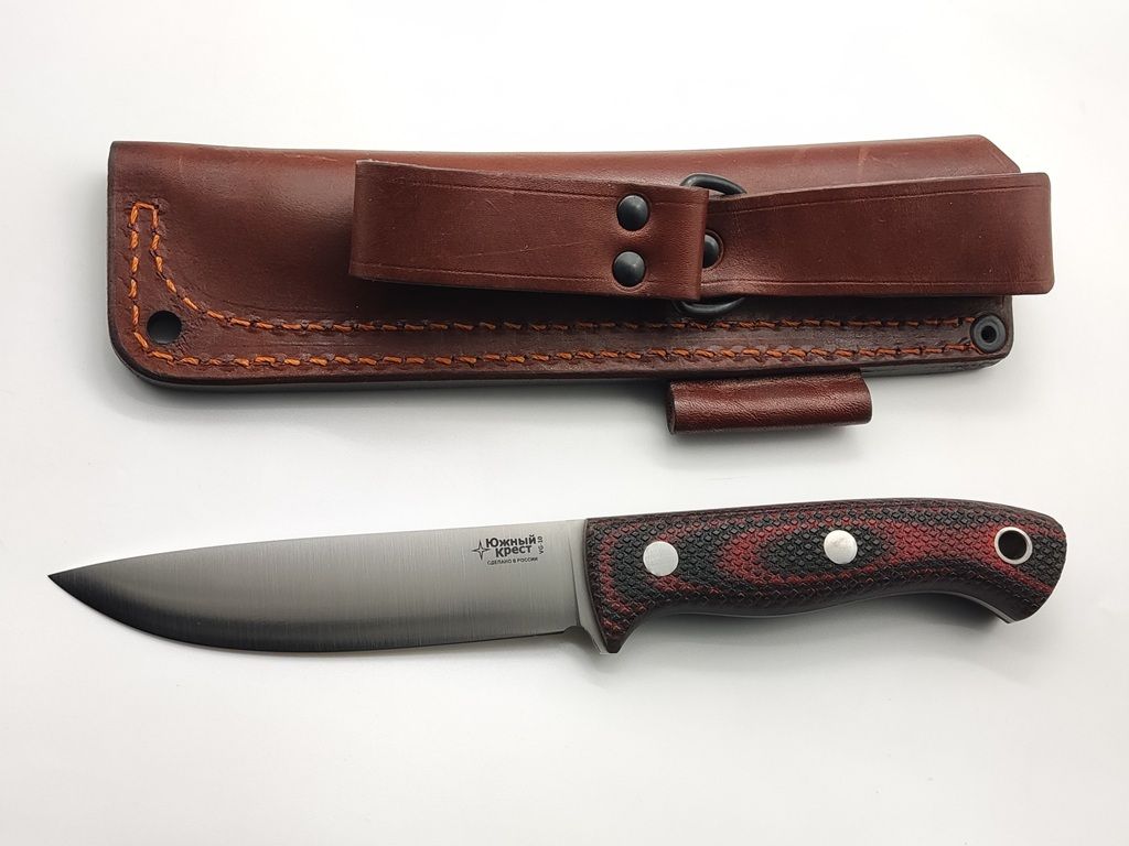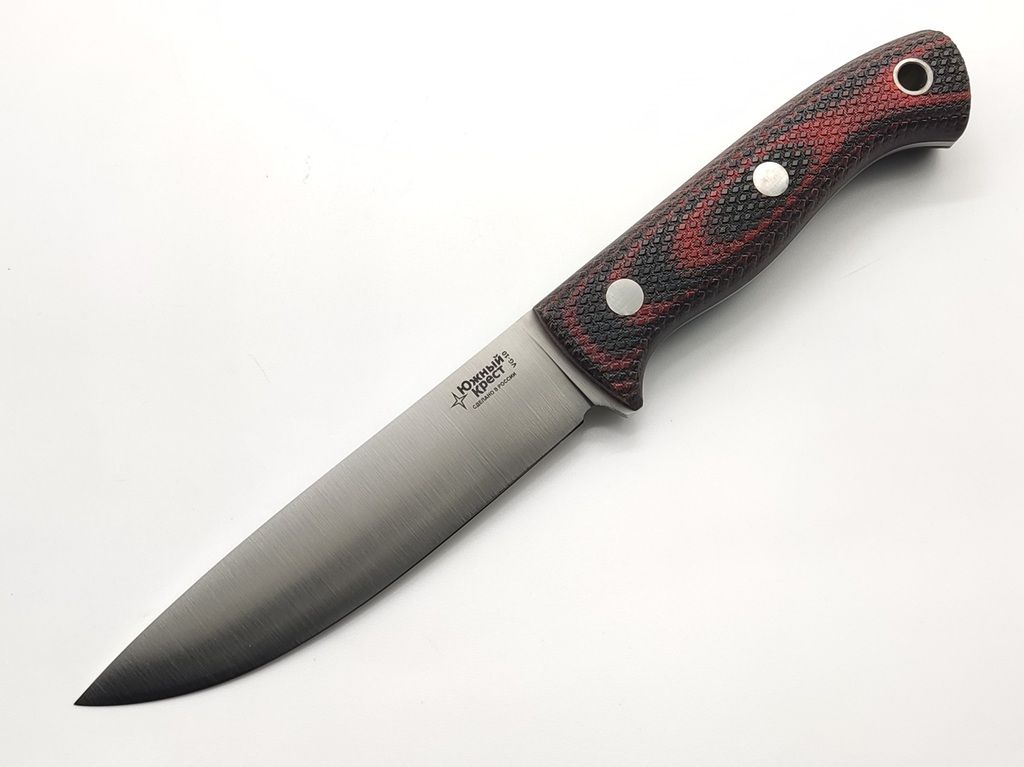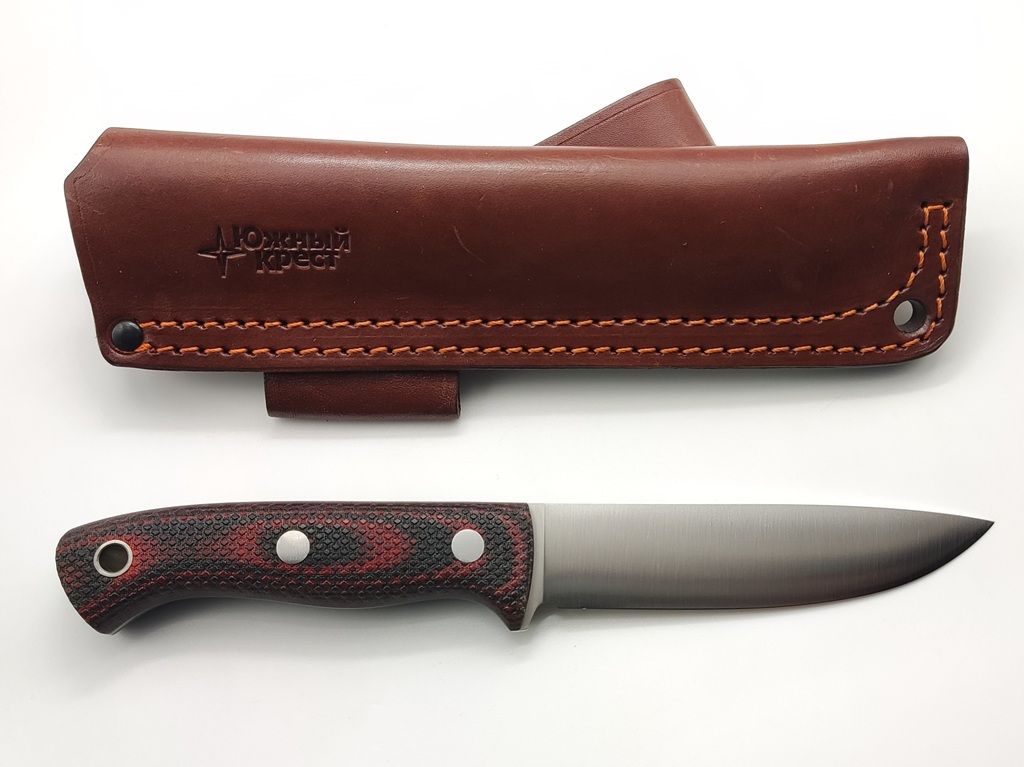 Micarta - отличный материал для рукояти ножа. Изготавливается из слоев ткани, пропитанной синтетическими смолами. Материал часто используется в электротехнике, больше известен как гетинакс. Легко обрабатывается и полируется. Микарта не впитывает воду, нейтральна к агрессивным средам, не меняет свойств при морозе и высоких температурах. Для того, чтобы рука не соскальзывала при работе, на накладки нанесена оружейная насечка. Как показывает практика, при такой обработке накладок рука не скользит даже в дождь и при попадании грязи.