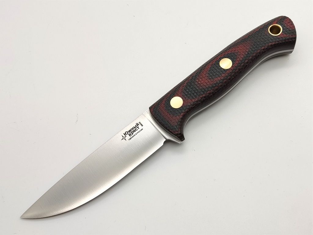 Micarta - отличный материал для рукояти ножа. Изготавливается из слоев ткани, пропитанной синтетическими смолами. Материал часто используется в электротехнике, больше известен как гетинакс. Легко обрабатывается и полируется. Микарта не впитывает воду, нейтральна к агрессивным средам, не меняет свойств при морозе и высоких температурах. Для того, чтобы рука не соскальзывала при работе, на накладки нанесена оружейная насечка. Как показывает практика, при такой обработке накладок рука не скользит даже в дождь и при попадании грязи.