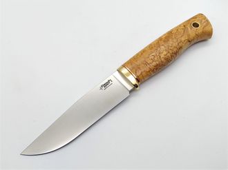Карельская береза - одна из разновидностей ценных пород дерева, имеющей характерные утолщения на стволе (кап). Отличается красивым узорчатым рисунком и высокой прочностью. Используется для производства украшений, шкатулок и дорогой мебели. Рукоять из карельской березы является твердой и не хрупкой, отлично переносит ударные нагрузки. Поэтому давно и успешно из карельской березы изготавливают рукояти для охотничьих ножей.