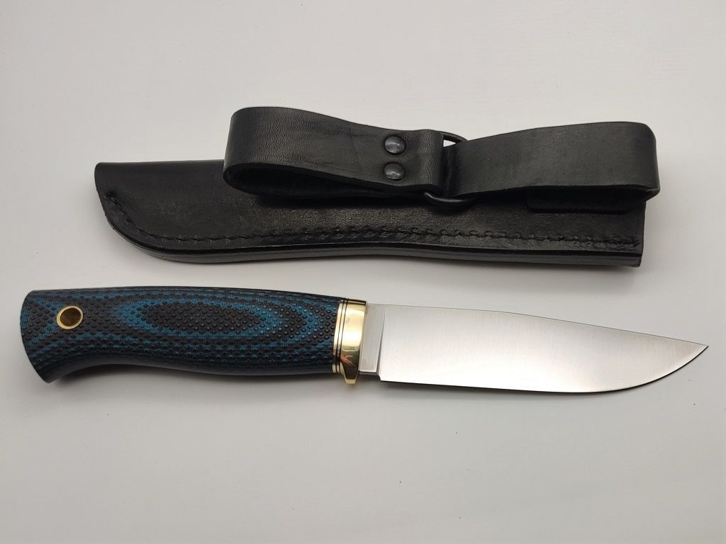 Туристический нож Стерх производства Южный Крест выполнен в классическом стиле: всадной монтаж, кожаные ножны с двумя видами подвеса. При этом используются в качестве рукояти используется не ценная порода дерева, а современная микарта с оружейной насечкой.