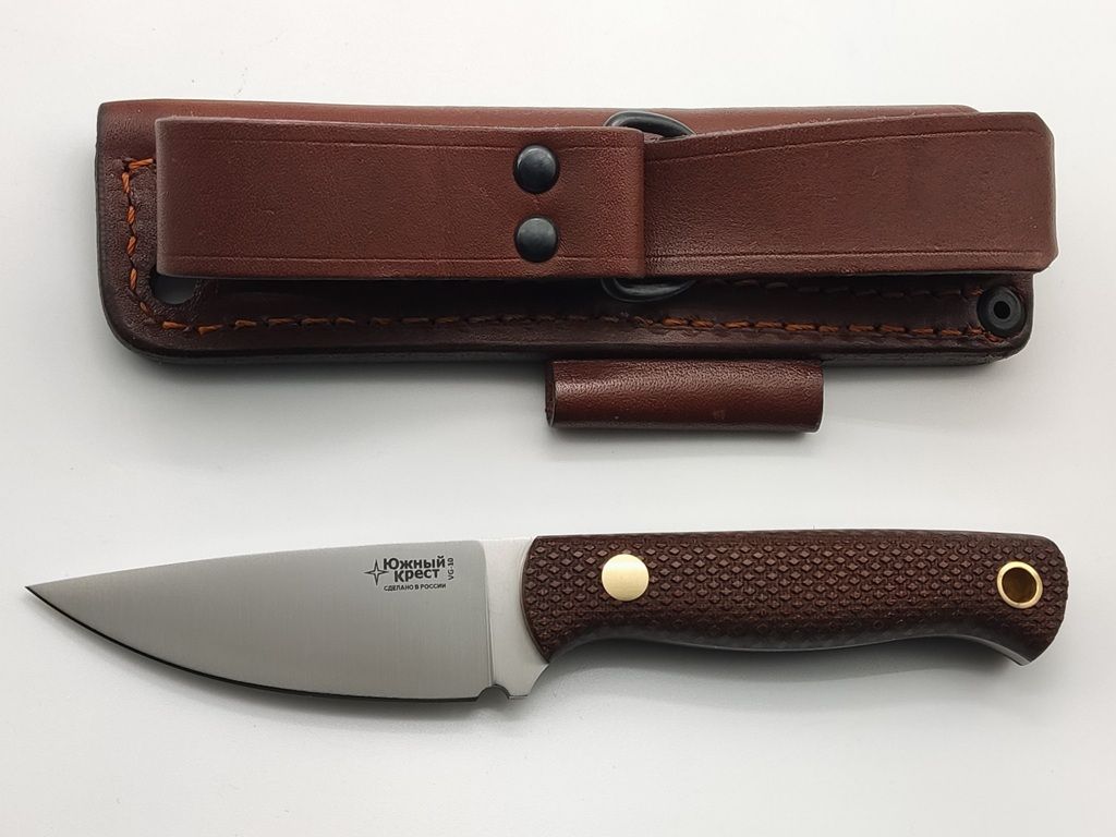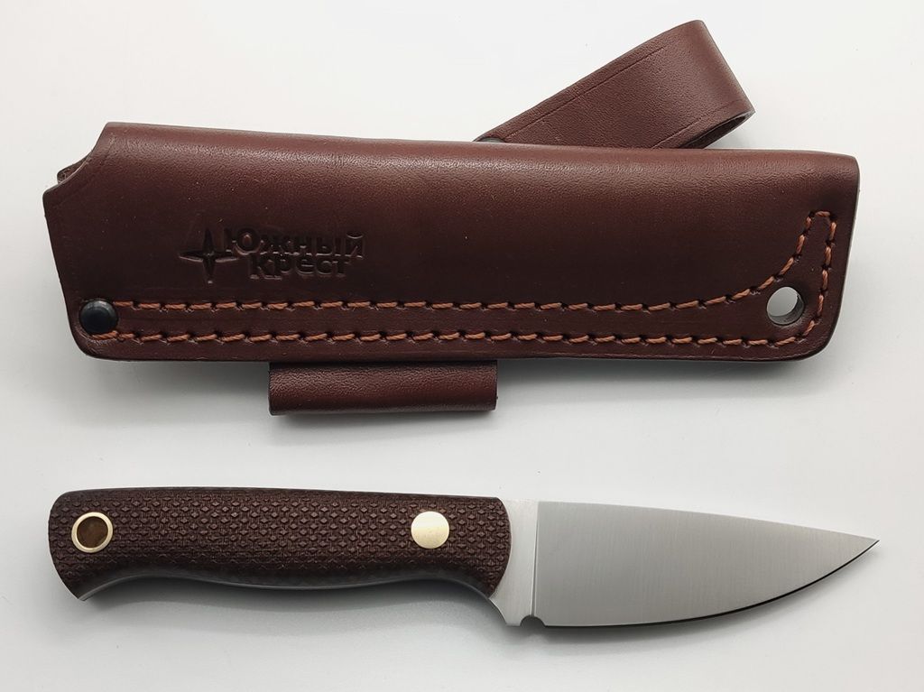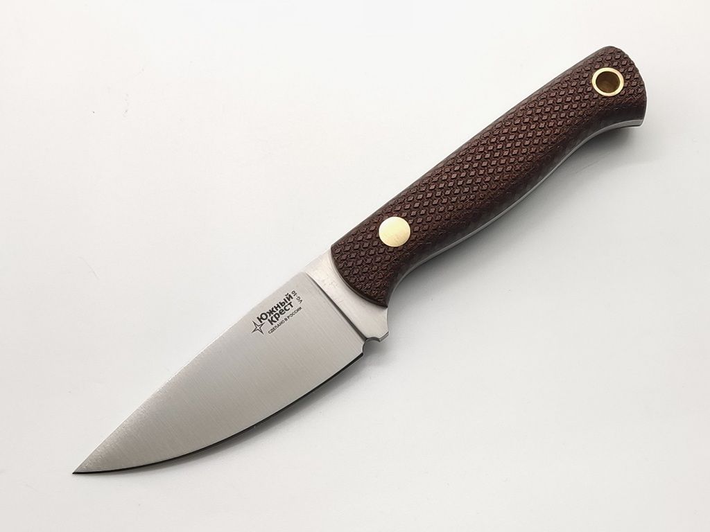 Micarta - отличный материал для рукояти ножа. Изготавливается из слоев ткани, пропитанной синтетическими смолами. Материал часто используется в электротехнике. Легко обрабатывается и полируется. Микарта не впитывает воду, нейтральна к агрессивным средам, не меняет свойств при морозе и высоких температурах. Подбор цвета и дизайна микарты делает нож красивым и привлекательным. Оружейная насечка на рукояти является ноу хау Южного Креста.