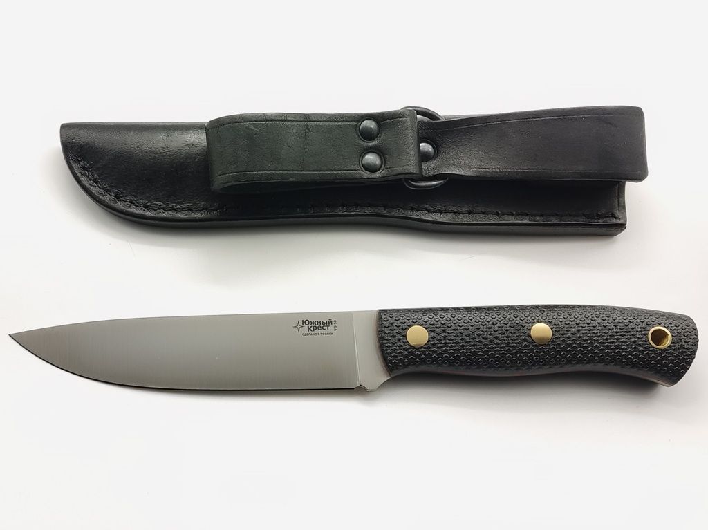 Micarta - отличный материал для рукояти ножа. Изготавливается из слоев ткани, пропитанной синтетическими смолами. Материал часто используется в электротехнике, больше известен как гетинакс. Легко обрабатывается и полируется. При этом микарта остается прочным материалом, не скользит в руке, имеет хорошую теплопроводность. Совершенно не впитывает влагу и стоек к агрессивным средам. Подбор цвета и дизайна микарты делает нож красивым и привлекательным. В данном экземпляре рукоять из комбинированной красно-черной микарты, новая расцветка Южного Креста.