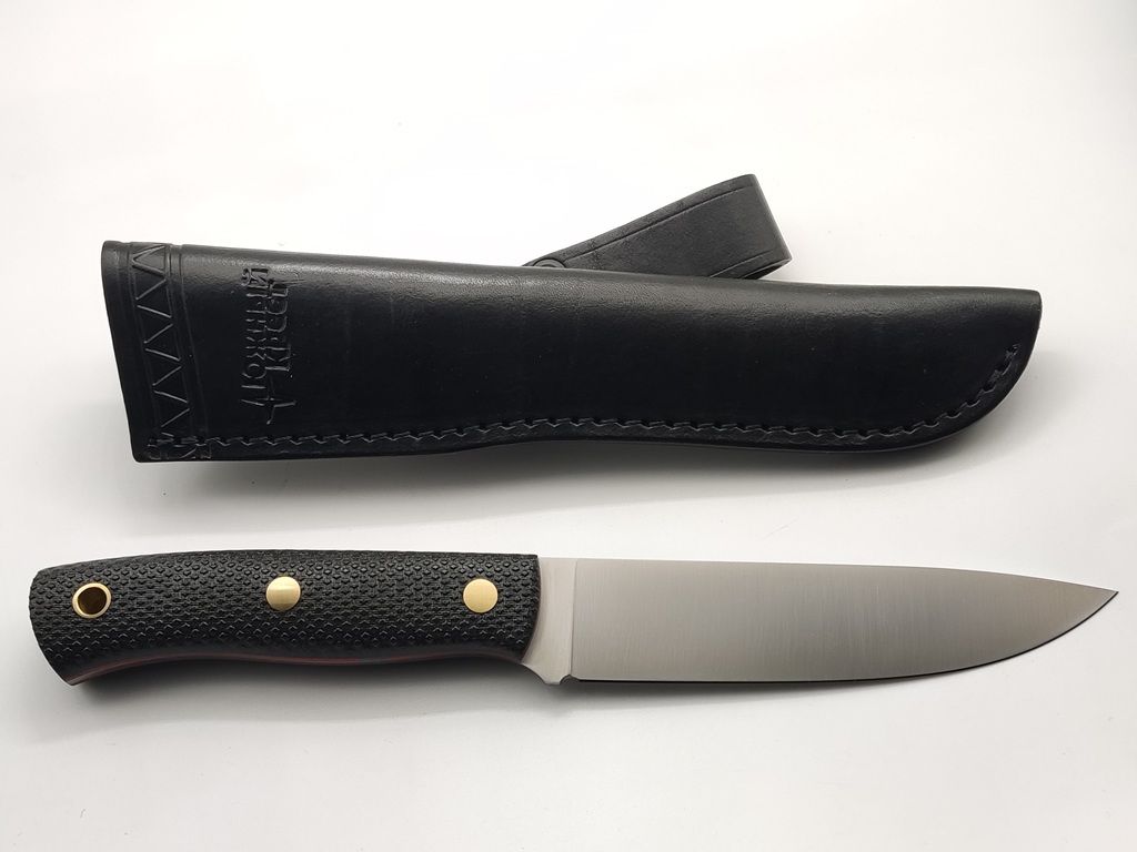 По конструкции - цельнометаллический нож с накладками. Рукоять крепится на две латунные стяжки Корби и трубчатую клёпку под темляк. По форме клинка нож относится к типу DROP-POINT. Рукоять полноценная, обеспечивает уверенный хват при работе. На рукояти фирменная оружейная насечка, предотвращающая соскальзывание руки даже во влажной среде.