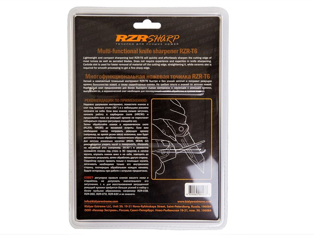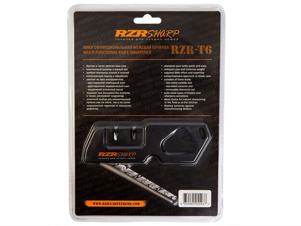 Многофункциональная ножевая точилка RZR-T6 - это легкий и компактный инструмент. Быстро и без усилий заточит и поправит режущую кромку большинство ножей, а также серрейторные клинки. Не требует опыта и знаний по заточке ножей. Карбидный слот предназначен для более быстрого съема материала и заусенцев с режущей кромки. Керамический слот необходим для последующей мягкой обработки обработки и правки клинка. Также имеется алмазный мусат для более продвинутых пользователей.