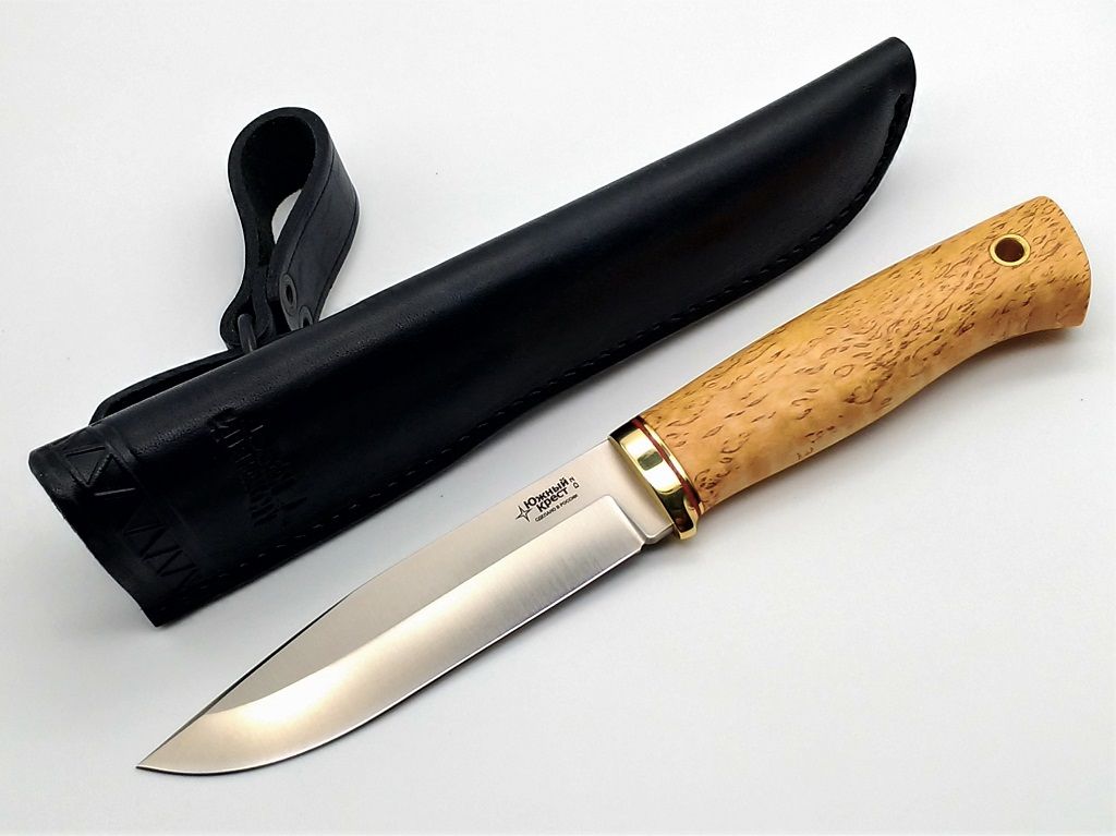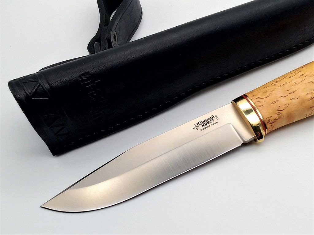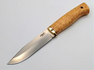 Классический охотничий нож с вогнутой заточкой и рукоятью из карельской березы